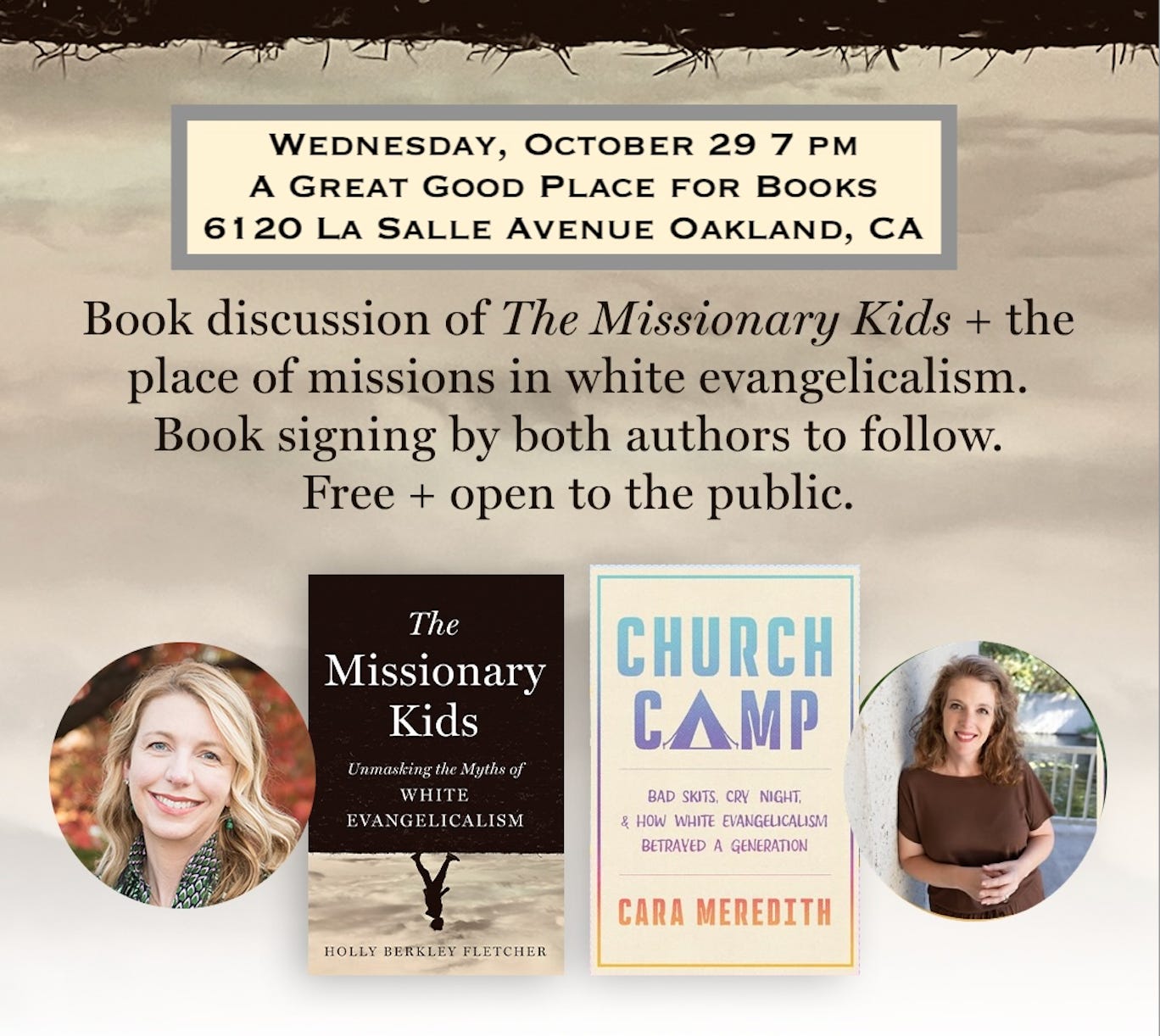 on Wednesday, October 29th, 7 pm at Great Good Place for Books. We’ll mostly be talking about her new book, The Missionary Kids, but I have a feeling we’ll probably talk about Church Camp a little bit too.4Join us!